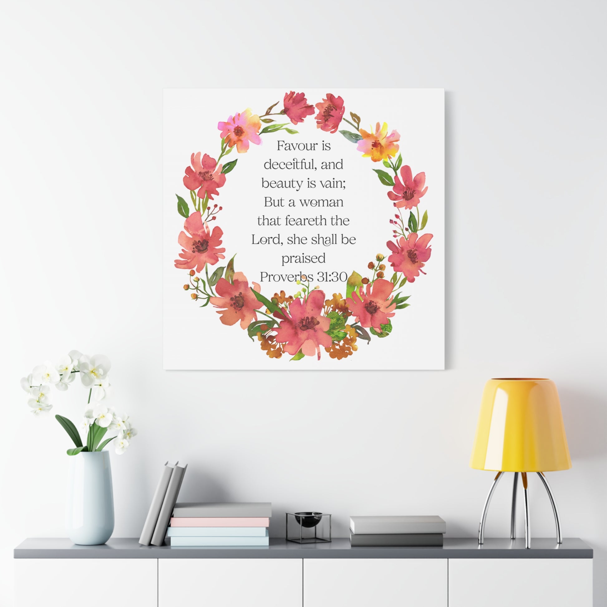 Floral Scripture Canvas Wall Art, Home Decor, Inspirational Gift, Proverbs 31:30, Christian Decor, Women’s Empowerment, Motivational Wall Art