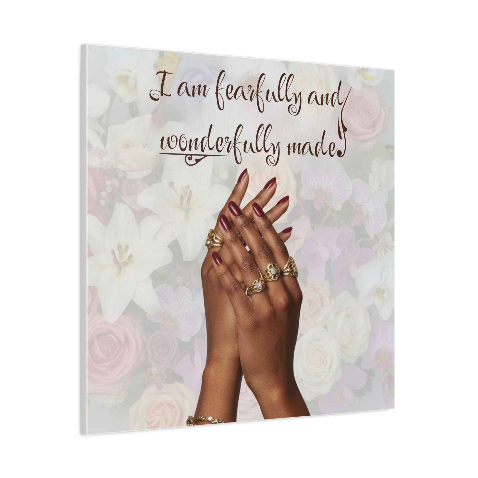 Elevate your space with this stunning matte canvas, framed and ready to display. Featuring the empowering phrase "I am fearfully and wonderfully made" against a beautiful floral backdrop, this artwork emits a warm and uplifting vibe. Perfect for adding a personal touch to your home or office, this canvas serves as a daily reminder of self-love and confidence. Ideal for anyone looking to inspire positivity in their environment, it’s perfect for gifting during special celebrations like birthdays, housewarmings, or even holidays such as Mother’s Day and Thanksgiving. Available in multiple sizes, it seamlessly blends into various decor styles, enriching both modern and traditional settings.